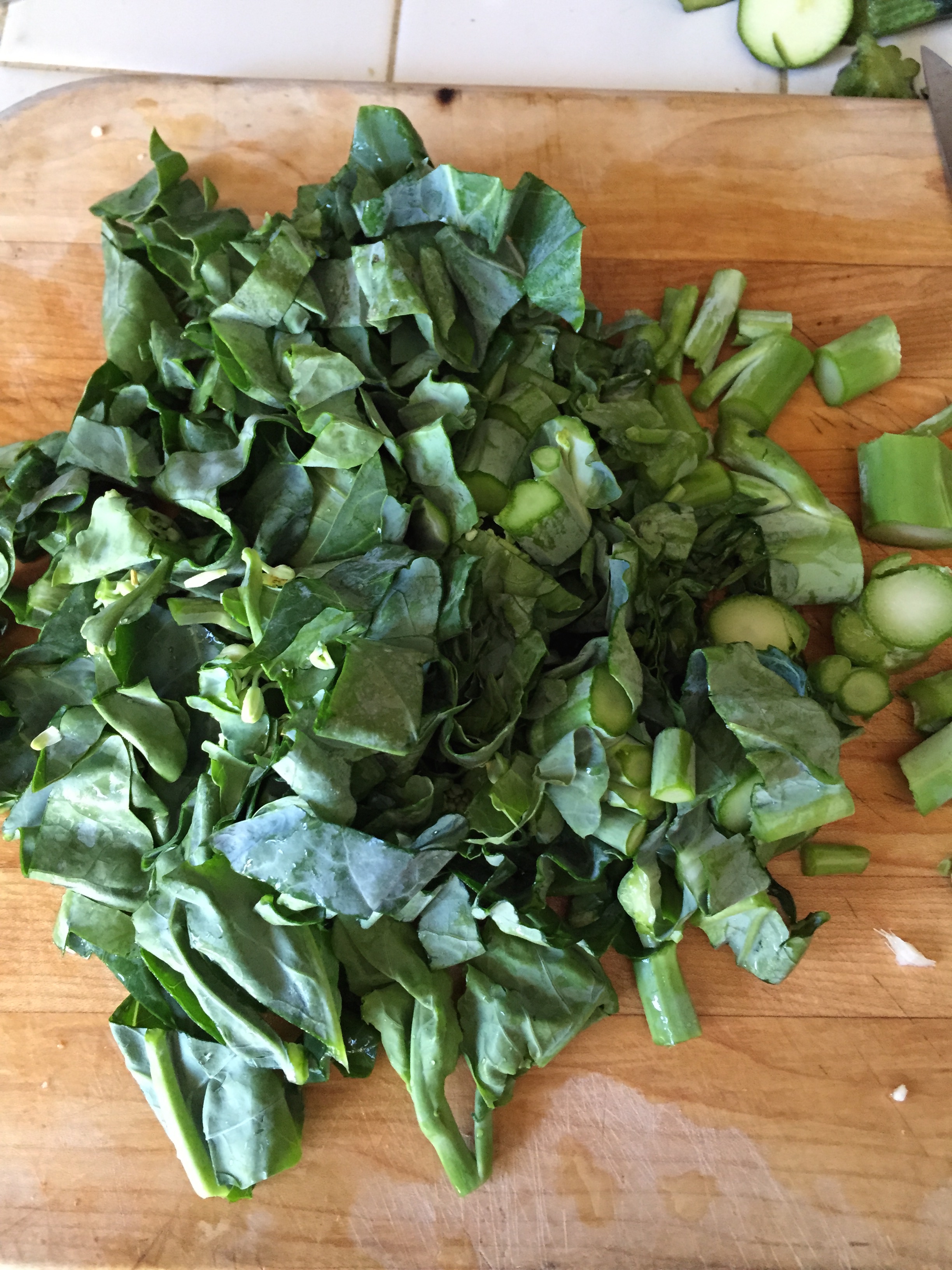 Cut the onion, garlic, leafy greens, and zucchini