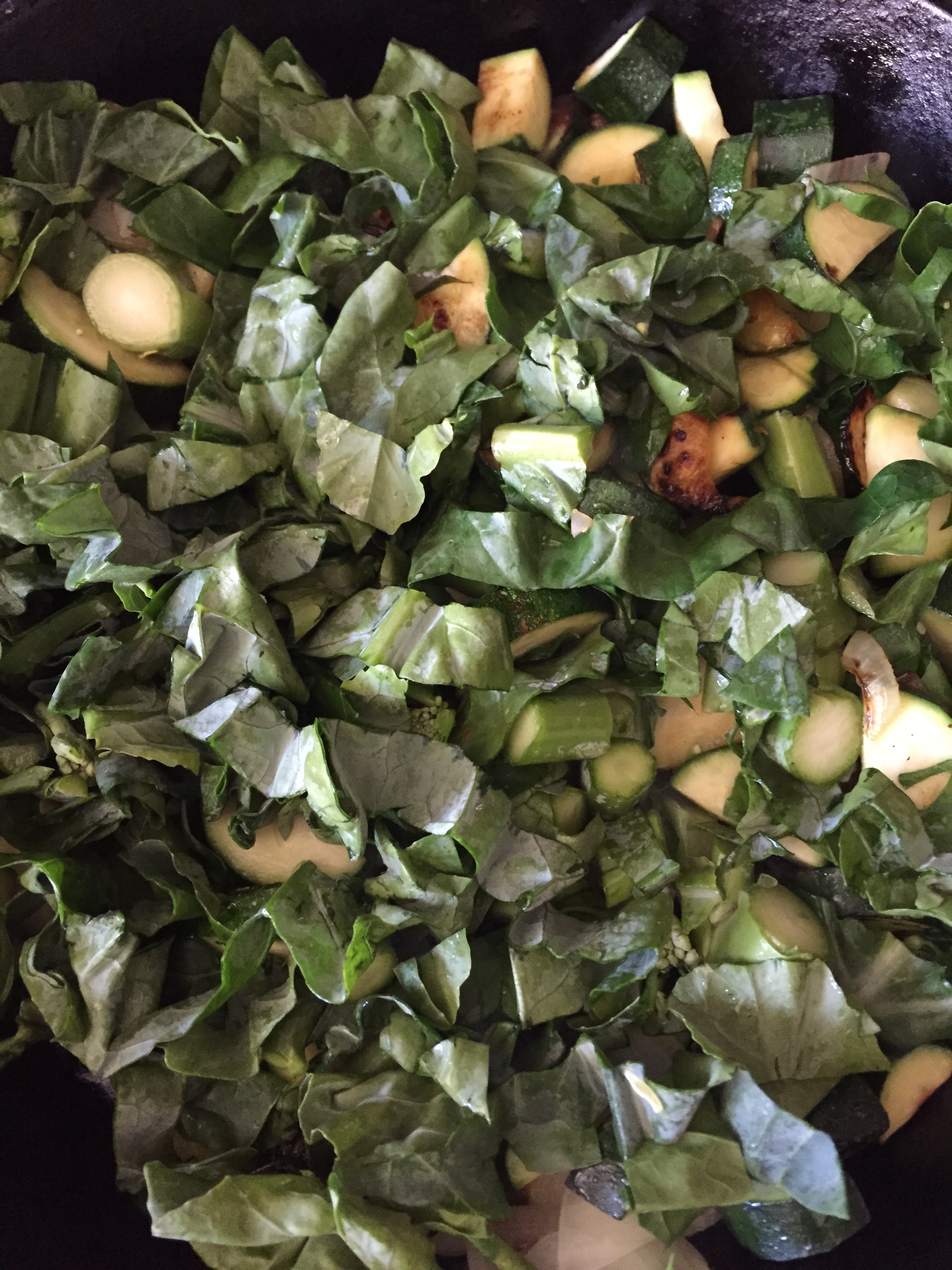 - Cut the onion, garlic, leafy greens, and zucchini. Sauté together.