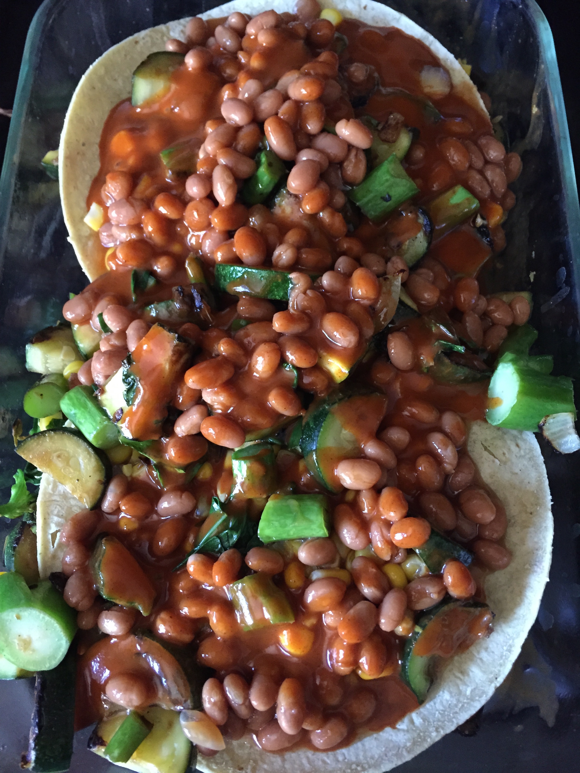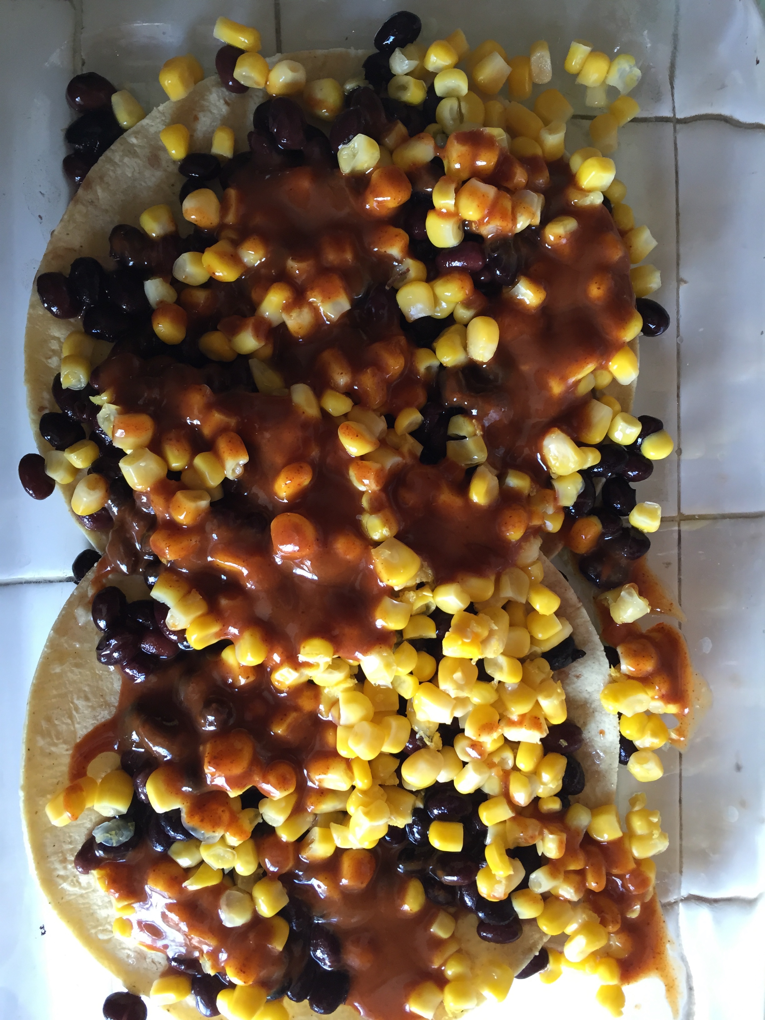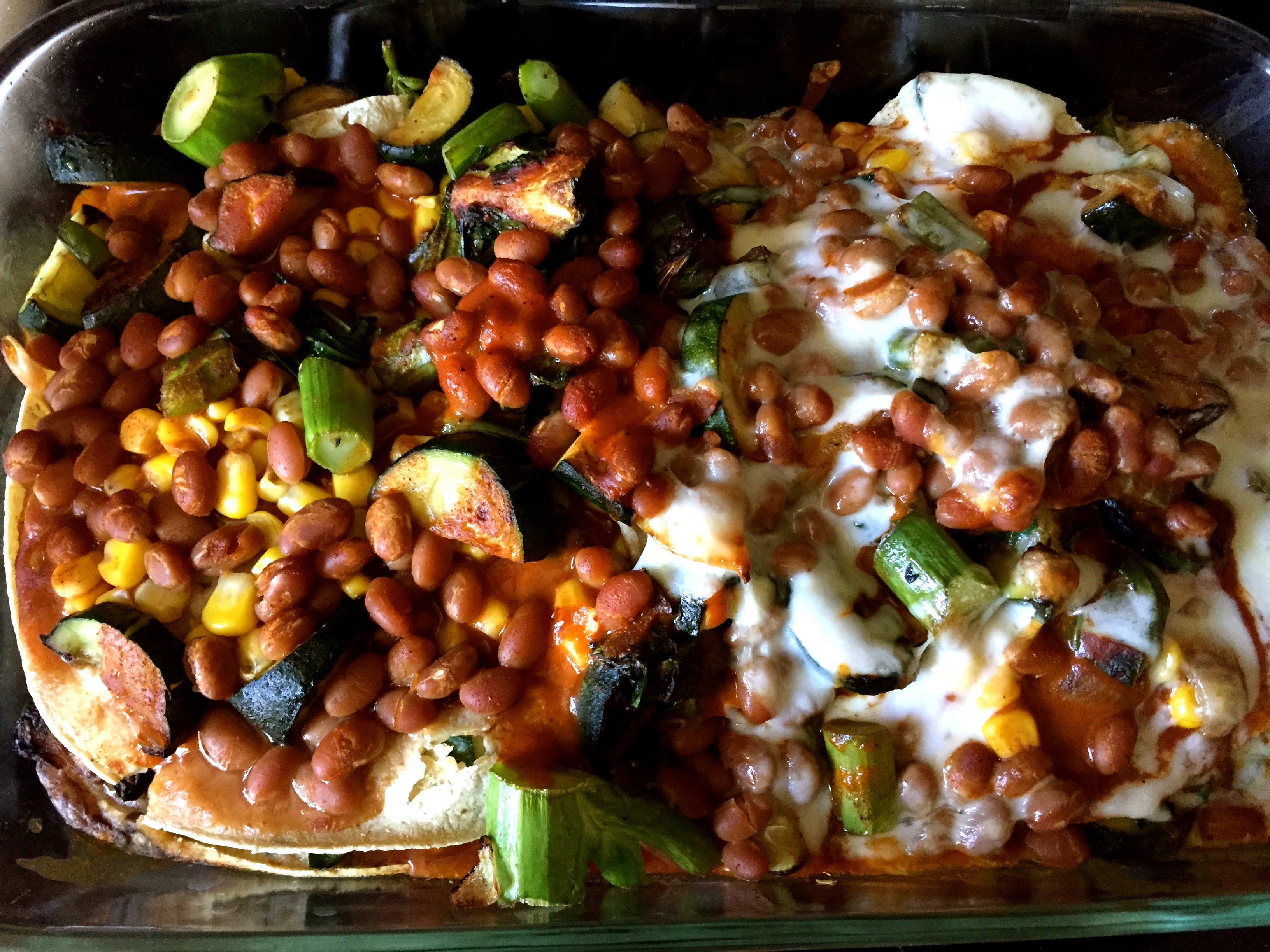 - Place a layer of tortillas and a layer of beans and corn in a baking dish. Top with enchilada sauce.
